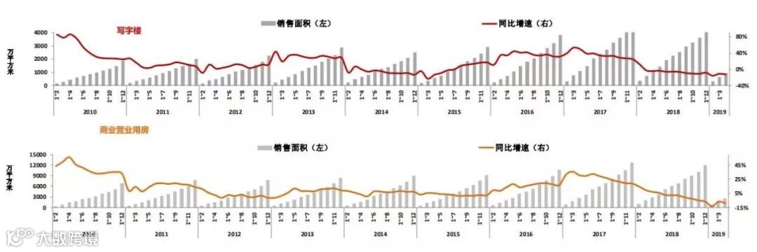 图:2010年-2019年1-4月全国商办销售面积及同比增速