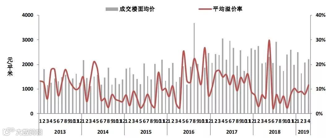 图:2013年-2019年4月300城商办用地楼面价及溢价率