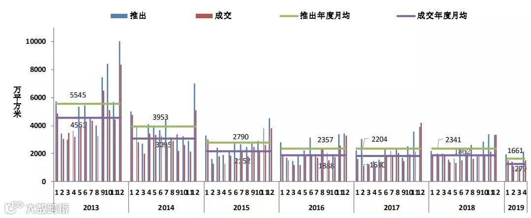 图:2013年-2019年4月300城商办用地推出及成交面积