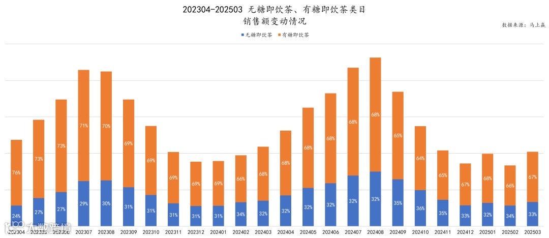 在这一节奏下,无糖即饮茶在即饮茶中的占比持续扩大,2024年大部分月份销售额显著高于2023年同期。