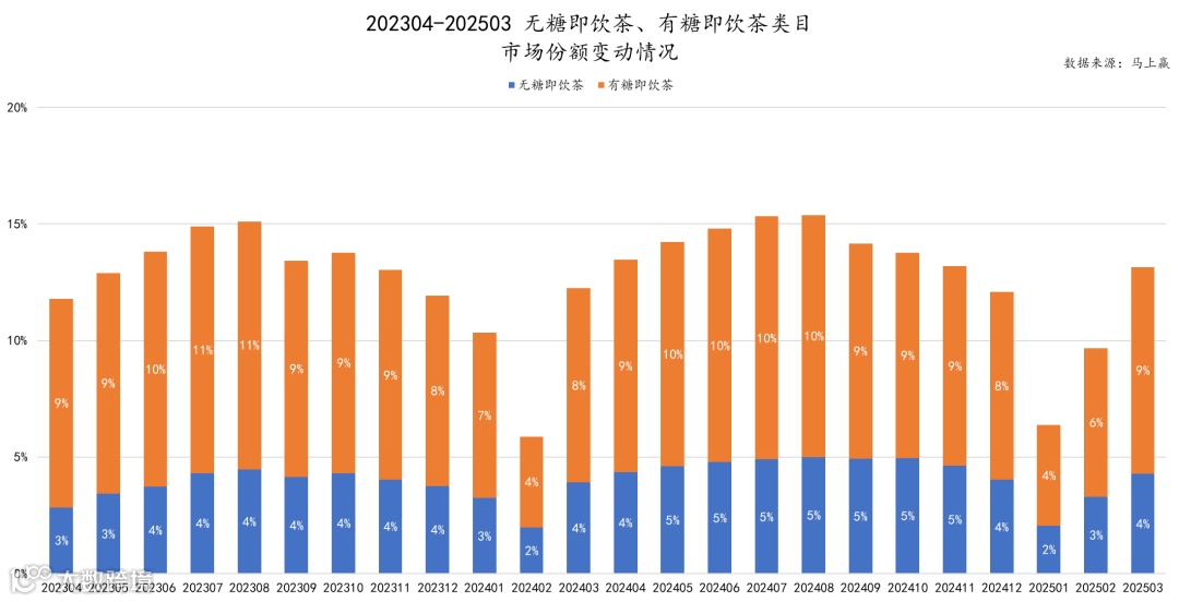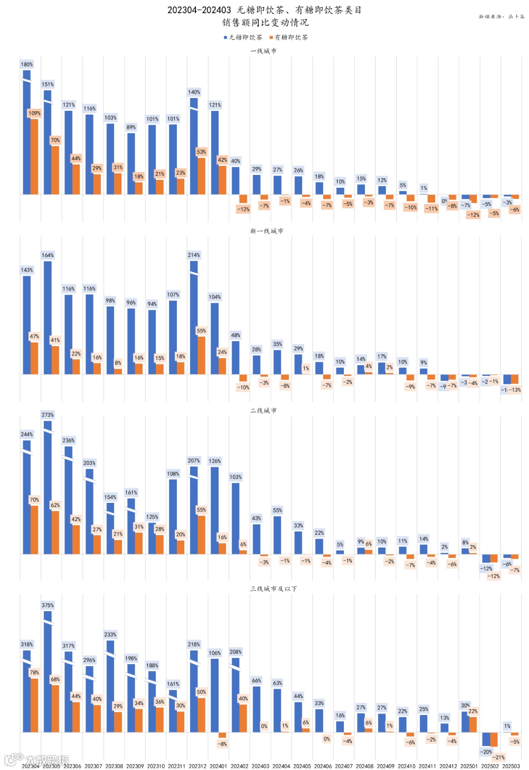 进入2025年初,尽管受节庆时点错位影响,个别月份出现阶段性波动,但更值得关注的是,节后各业态的增长趋于停滞,同比增长明显放缓。这或许预示着无糖茶类目正在从增量拓展转向存量博弈,市场竞争节奏进入新阶段。