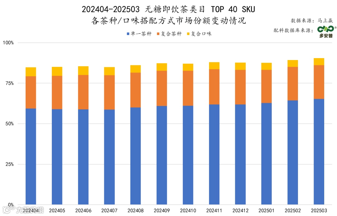 基于马上赢品牌CT中,202404~202503一年时间内,无糖即饮茶类目中的非组合装产品TOP 40 SKU,以及时间段内上市的新品TOP 40 SKU形成的两个集合,以及多安普数据库(www.dap-data.com)中这些SKU的配料表、技术指标与配料相关信息,通过从“配料-配料表-产品-市场销售”表现的全链路交叉/穿透,来观察类目TOP产品背后,消费者选择反映在产品配料/口味上不同选择的趋势。