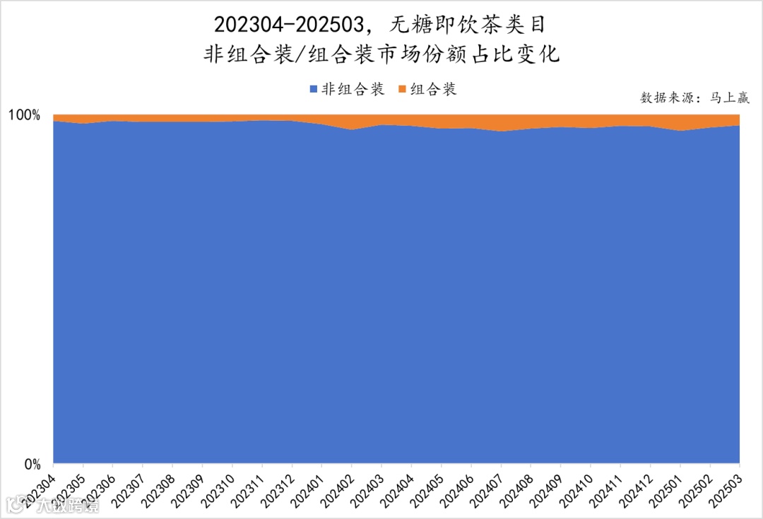 从组合/非组合装占比来看,目前无糖即饮茶市场仍以非组合装为绝对主流,占比始终高达九成以上,组合装虽然有所增长,但整体份额依旧十分有限。