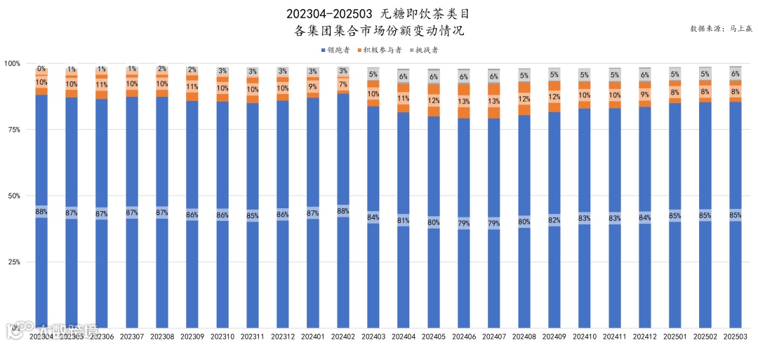 我们拉取了三类集团在202304-202503,两年时间段中,市场份额占无糖茶整体的变动情况。