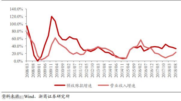2017年至2018年地产整体融资环境较差,房企普遍采取快销售慢施工的策略,通过预收款的周转加速提升对下游的占款能力。开工与竣工增速剪刀差扩大,但2016年销售高增长,新房销售合同约定交房周期一般在2至3年,2018年竣工增速较低,低基准期因素叠加今年交付增加,收入结转增速将会显著增长。另一方面,开发商拿地意愿降低,存货扩张速度下降,总资产周转率将显著提升。