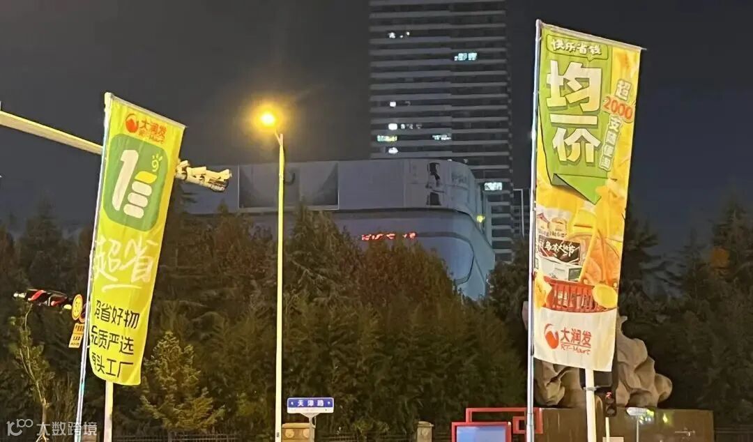 大润发入口出便是“均一价”活动字样板,下方堆头陈列的就是“大拇指超省(FP)”系列商品。