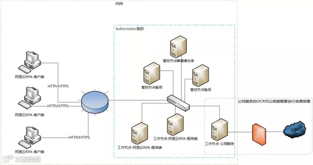 在部署上阿里云RPA提供了行业领先的阿里云Docker部署方式,客户端可以访问外网环境,但负载均衡器、nginx反向代理器、数据库等部署在内网环境,应用程序加密存储在数据库中,将内外网访问隔离,大大提高了系统的安全性。