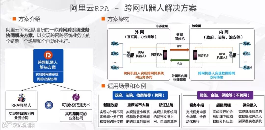 此外,阿里云RPA团队独家研发的“跨网机器人解决方案”成为亮点之一,此机器人可实现外网和内网在完全隔离情况下的数据传输,极大提升数据传输的安全性。其技术原理则是:内外网之间可通过两台同步机之间的图像识别技术传输数据,再通过RPA机器人完成系统数据自动一体化录入,目前已经在新疆政府、重庆城市大脑等众多政务领域获得最佳实践和落地。
