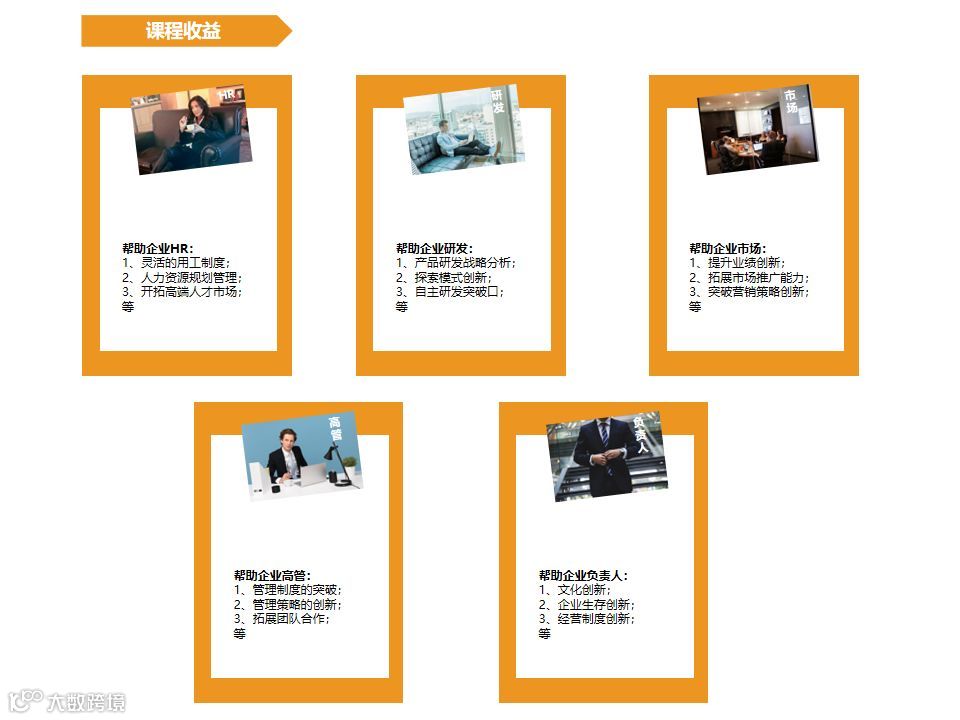 13:30-14:00 签到; 14:00-17:00 创新者的思维修炼; 引言:创新主题互动; 第一单元 创新的正确认知 1 创新的原点和分类; 1.1 创新的10个原点; 1.2 创新分为颠覆式创新和微创新。 2 创新的正确认知——创造出可行的新形式; 2.1 创新不仅是发明-微创新/颠覆式创新; 2.2 创新需要有回报-可行性; 2.3 创新鲜有是全新的-迭代原则; 2.4 思考要超越原有层面-破局。第二单元 创新的紧迫性和必要性 1 创新的紧迫性和必要性; 1.1 理清学习的动机和目的; 1.2 创业者的正确认知; 2 管理者如何站在更高维来学习; 2.1 第二曲线&非连续性案例分析; 2.2 商业创新案例分析。 第三单元 以客户为中心的创新设计思维 1 以客户为中心的关键因素——【1】同理心 1.1 同理心正确认知及案例互动; 2 以客户为中心的关键因素——【2】鼓励创新 2.1 裂变式创新机制案例分析; 2.2 通用集团公司创新案例分析; 3 客户旅程地图及案例互动; 3.1 唐硕用户体验案例分析。 第四单元 以目标为中心的创新设计思维 1 创新设计思维项目流程:目标导向; 1.1 创新案例教学; 2 精益创业方法论中的微创新流程; 2.1 火箭发射式及精益创业的模式; 2.2 精益创业的逻辑框架。 第五单元 创新设计思维的重要特征 1 创新设计思维的12大特征; 1.1 客户中心,目标导向,右脑思维… 1.2 道术结合,超越现实,众筹模式… 2 创新设计思维的重要特征; 2.1 验证速度效果; 2.2 受到启发迭代; 2.3 切记感性抱怨。 第六单元 创新设计思维的最佳工具 1 POA组织设计思维工具; 2 互动及案例教学。 主办方后期系列课程介绍 |