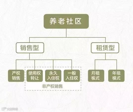 目前,就中国市场主流养老社区销售模式而言,我们大致可以把他们分为两类。一类是通过一次性支付购买产权或长久入住权益的模式,我们在此将其定义为“销售型”,主要类型有产权销售、使用权转让、永久入住权、一般入住权;另一类是通过按年或按月支付租金,我们在此将其定义为“租赁型”,包括月租模式和年租模式。