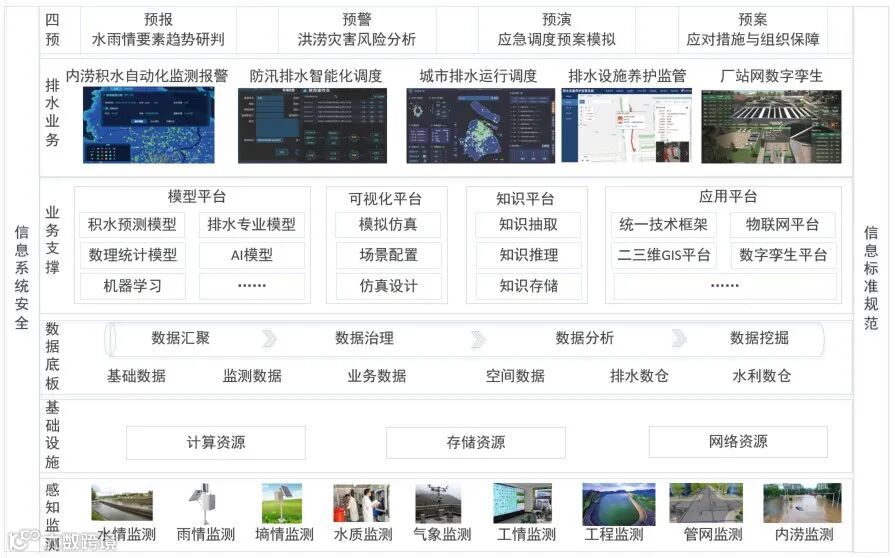 以GIS地理信息、物联网、云计算、大数据、数字孪生等现代信息技术为手段,摸清排水设施基础底数,汇集整合气象、水情、雨情、灾情、险情等数据资源,基于大数据挖掘平台、模拟仿真平台、专业模型平台,打造事前监测预警、事中指挥调度、事后总结分析的智慧水务管理体系。