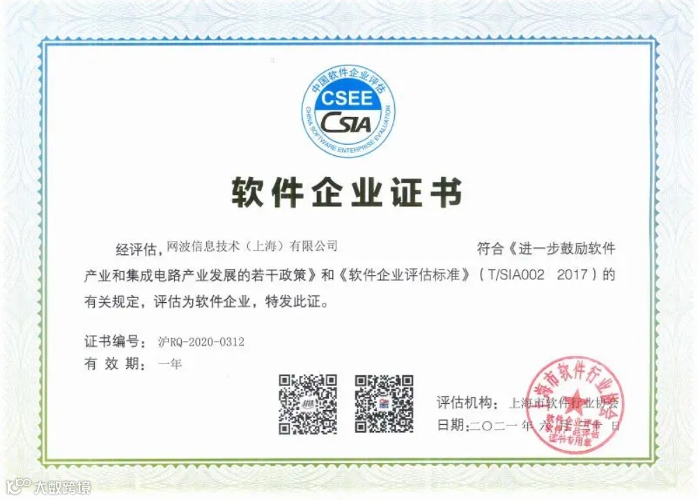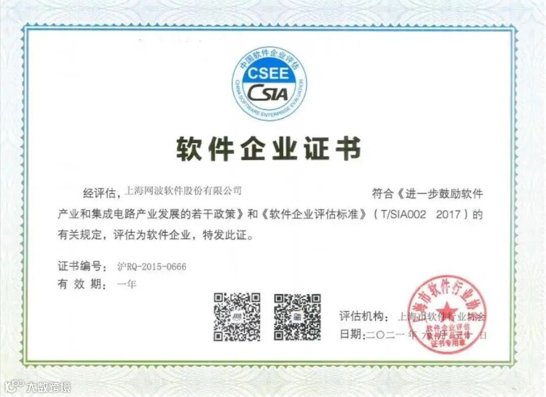 上海网波软件股份有限公司以及网波信息技术(上海)有限公司2021年度软件企业证书已更新。