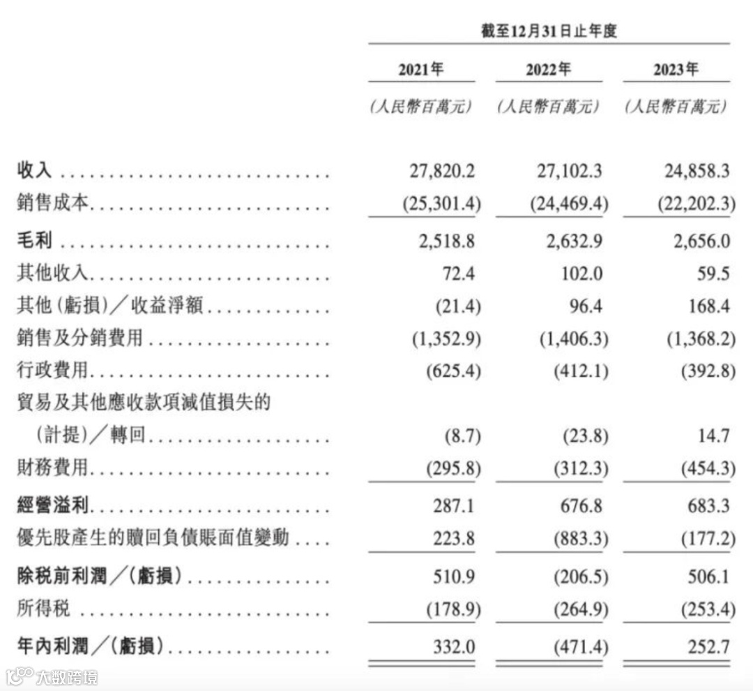 招股书数据显示,2021年—2023年,公司营收分别为278亿元、271亿元、249亿元;毛利率分别为9.1%、9.7%、10.7%;经调整净利润分别为1.08亿元、4.12亿元和4.3亿。