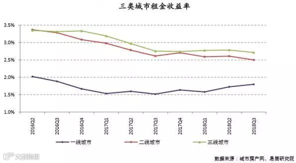 2018年三季度,根据城市房产网的数据,50个典型城市租金收益率为2.5%,环比下降3%,同比下降2%。
