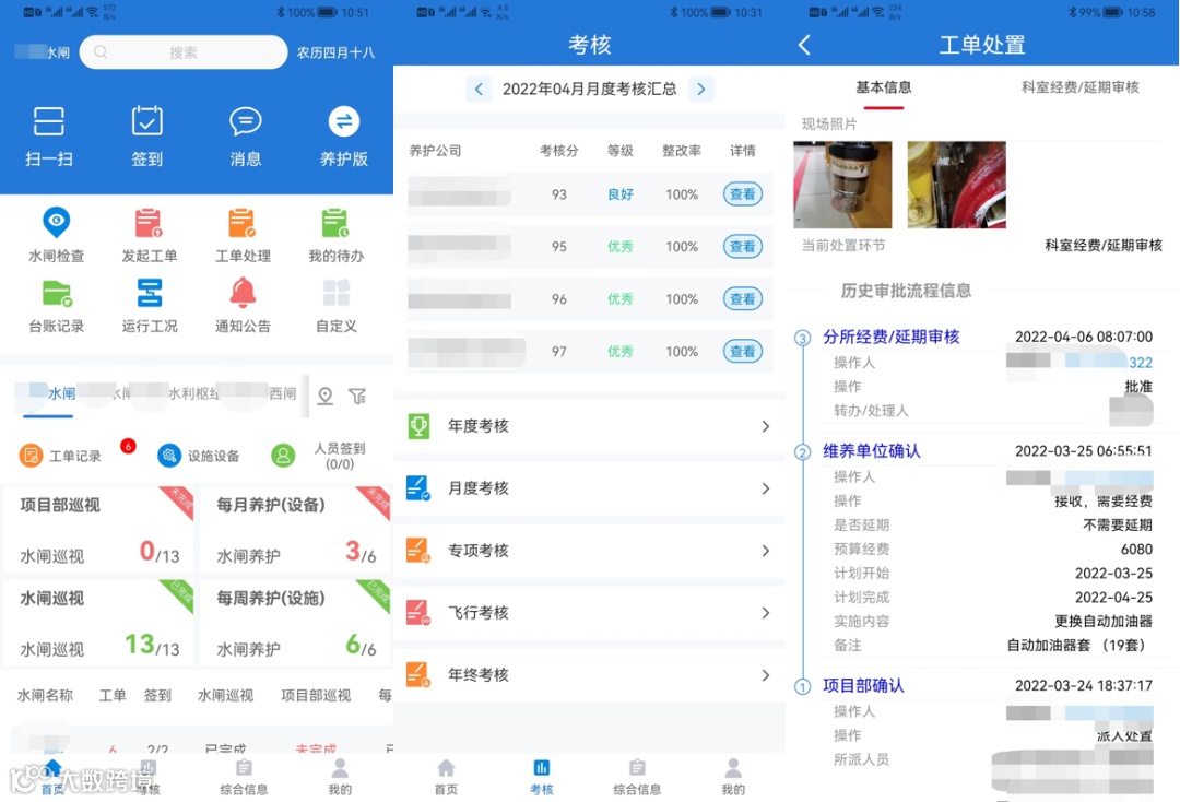 其中自动考核应用贯穿巡视、养护、工单、考勤等业务过程,根据业务运行实际情况机器自动进行客观分评分,自动生成月度、年度考核排名,同时,支持专项考核、飞行考核、年终考核等操作。经费管理以年度养护预算为基准,根据养护和维修业务动态执行情况,自动汇总经费具体执行情况,支撑养护经费精准拨付和经费使用过程高效监管。