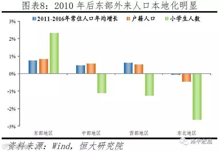 2011年~2016年,东部、中部、西部、东北地区常住人口分别年均增长0.75%、0.48%、0.63%、-0.06%,常住人口占比分别变化0.4、-0.2、0.1、-0.3个百分点。尽管东部地区常住人口增长率明显下降,但其户籍人口和小学生增长率却不降反升。