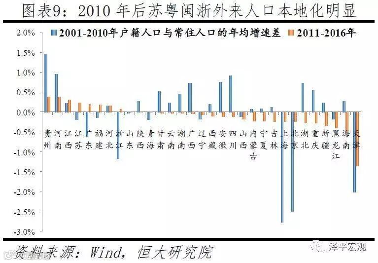 人口回流更为明显的则是湖北、重庆、四川、安徽、湖南、广西等省,常住人口增长于2011年~2016年超过户籍人口增长。而江苏、广东、福建、浙江在2001年~2010年户籍人口年均增速均小于常住人口增速,表明大量吸引外来人口流入。