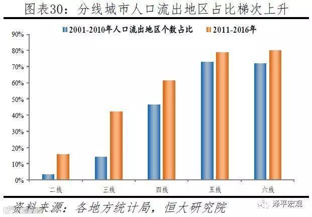 分线看,二线城市人口流出地区个数占比从3.1%增至15.6%,三线城市从14.1%增至42.2%,四线城市从46.4%增至61.2%,五线城市从72.9%增至78.8%,六线城市从71.1%增至79.9%。