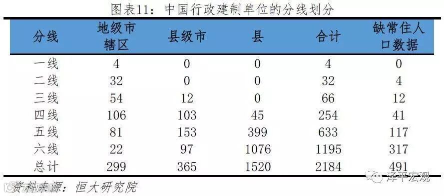 三线城市为GDP多在1000亿元以上的弱小省会城市和部分较强的地级市辖区,以及少数实力突出的县级市,共66个。四线、五线、六线城市分别为GDP在400亿元以上、150亿元以上、150亿元以下的其他城市,主要是较弱小的地级市辖区、县级市及县,个数分别为254、633、1195个。其中,有491个地区因未公布当前常住人口数据而未纳入分析,占全部地区个数的22.5%。