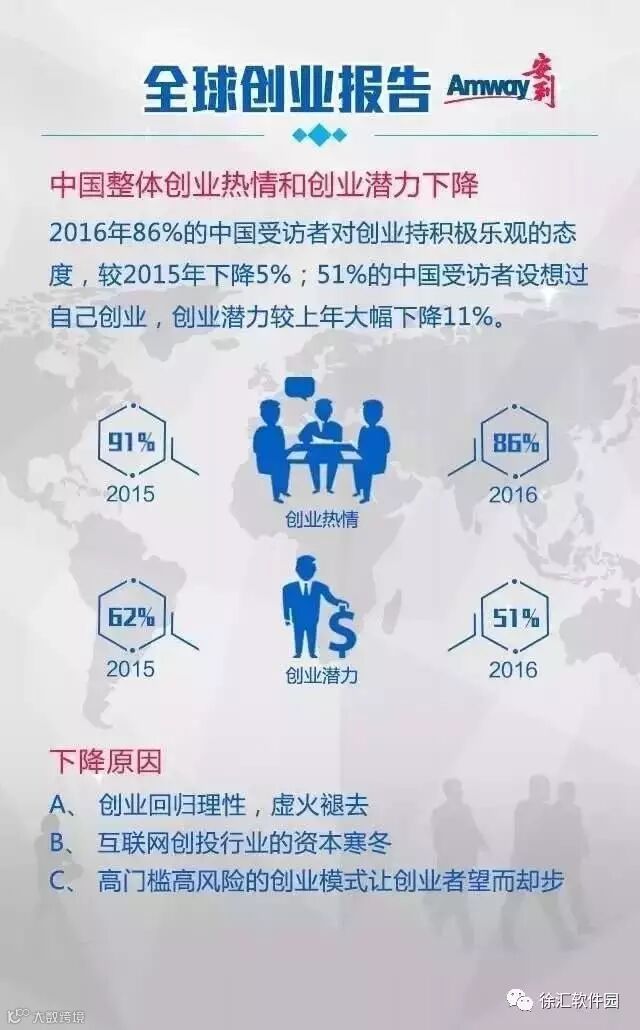 最近,《2016安利全球创业报告》(Amway Global Entrepreneurship Report, AGER)在北京发布,这份报告说,中国的创业指数从2015年的79%下降到74%,在去年,中国还是全球创业指数最高的国家(与印度并列第一),今年却被越南、印度、泰国超过,下滑至第四名——你很快能从这个数据中得出一个令人欣慰的结论:“不是我不会写,而是老师出的题太难。”
