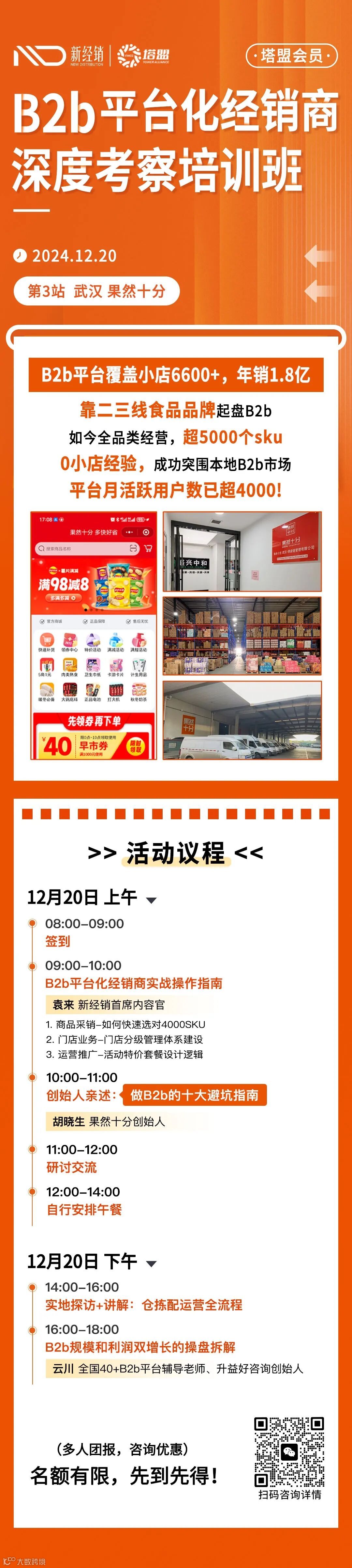 PS:「新经销」将于12月20日组织一场深度游学,走进「武汉果然十分」,深度研讨经销商转型区域B2b的发展路径和策略。