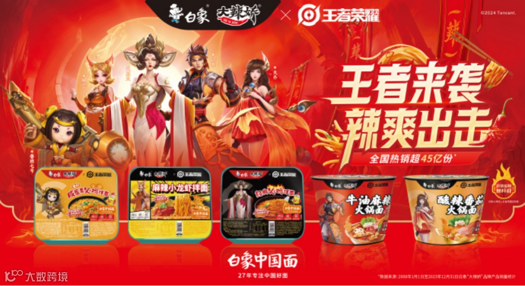 经典国民游戏王者荣耀拥有超1亿的18-35岁年轻日活用户,早在2023年,白象大辣娇聚焦电商已首次与王者荣耀进行IP联名,取得了显著的市场增长。