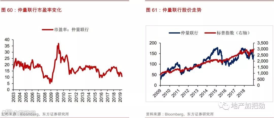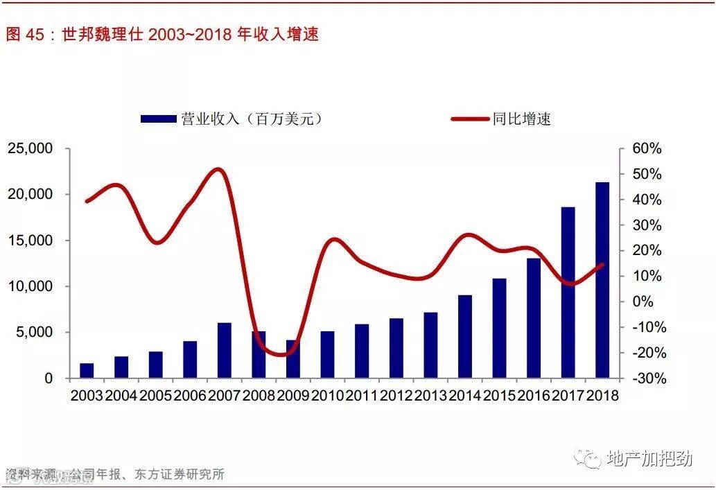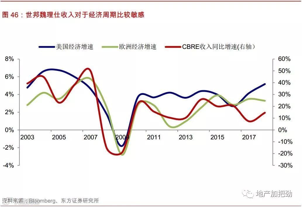 收入增速与宏观经济变化高度相关,且波动较大,表现出一定的周期性。公司的费用收入很大一部分来源于公司促成物业租赁和销售交易所提供的顾问咨询服务, 2018年公司三大业务板块中的顾问服务占据了总费用收入的70%,其中的物业租赁和销售占到了总费用收入的49%。同时从物业种类上看,物业租赁和销售都是以办公写字楼和商业建筑为主,经济下行周期中这些物业的资产价格快速下跌,交易活跃度下降,公司能从物业交易中赚取的服务费相应减少。因此,公司整体的收入情况将很大地收到宏观经济的影响,并且表现出较大的波动性,经济下行、流动性压力、政治风险等因素都有可能对公司的稳定增长产生强烈的负面作用。区域上看,公司的收入有61%来源于以美国为主的美洲地区,26%来源于以欧洲国家为主的EMEA地区,公司整体的增长将很大程度上受到美国和欧洲经济变化的影响。