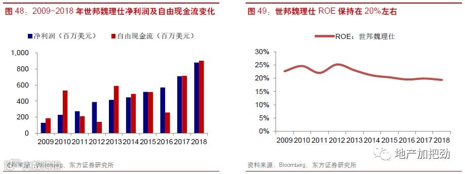 公司营业收入增长稳定,2018年实现收入163.2亿美元,同比增长12.9%,近5年年复合增速12%(公司2018年改变了收入确认方式,12%为根据年报调整过后的实际复合增速)。从收入结构上看,物业租赁占总费用收入的36%,项目设备管理、资本市场和项目开发服务及其他和分别占比18%、17%和12%,顾问咨询和投资管理占比8%和9%。