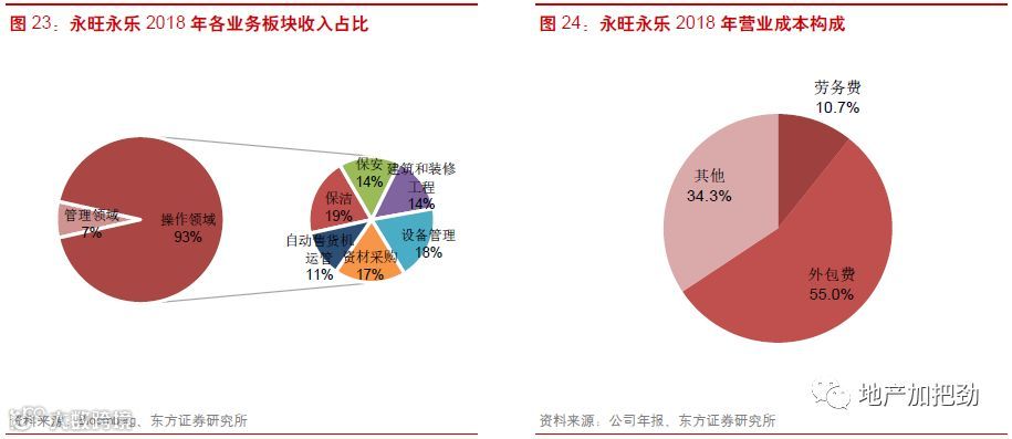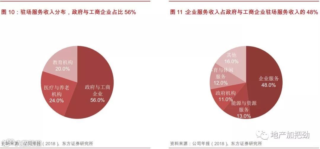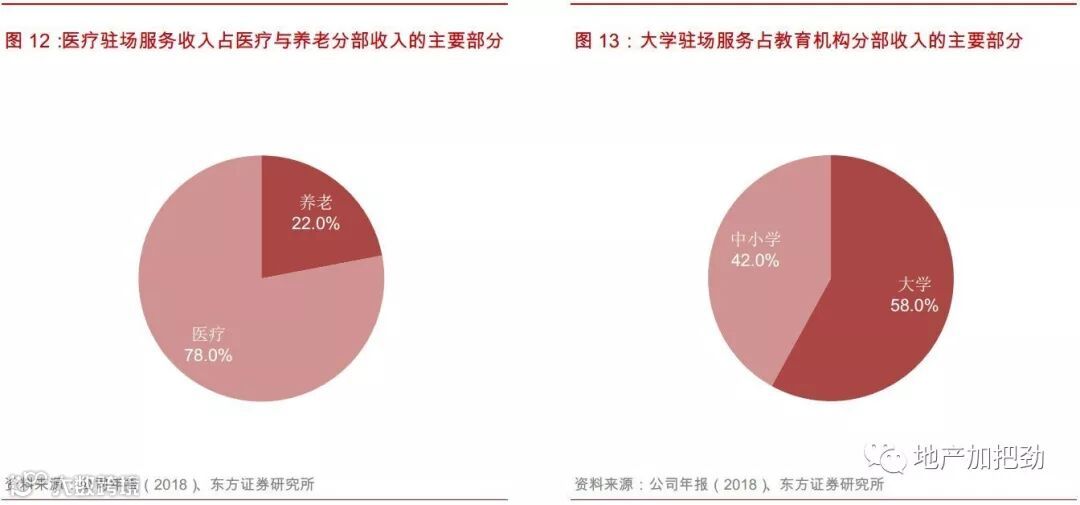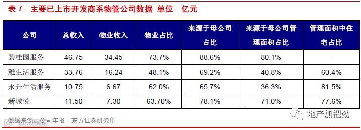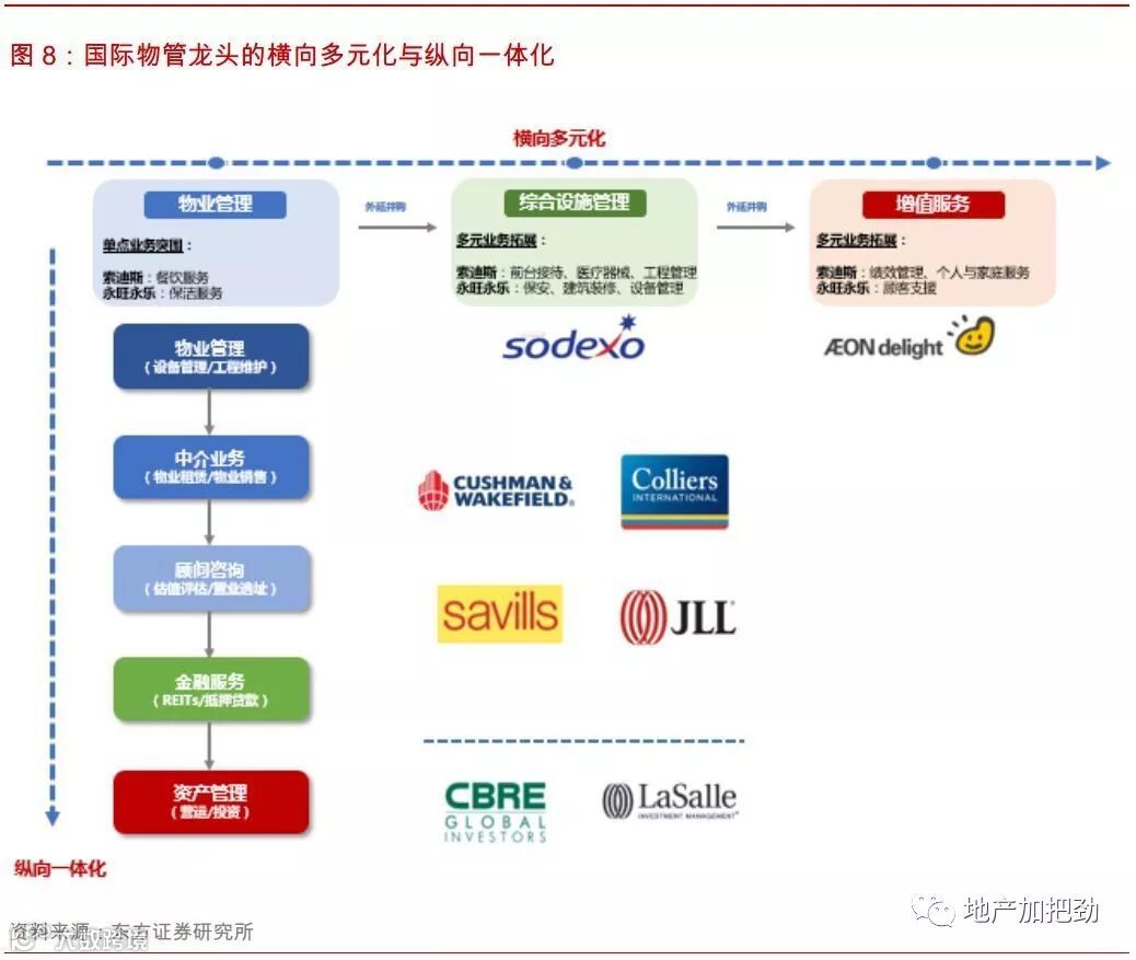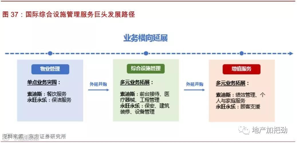 国内开发商系物管企业相比国际物管龙头有一个优势,即母公司可以稳定提供大量管理面积。住宅管理业务提供了强点业务,类似于索迪斯起步时的餐饮、永旺永乐的维修保洁、世邦的物业销售。依靠母公司提供的支持,公司可以获得稳定的收入来源和现金流.。这将使得开发商系的物管企业处于一个非常有利的位置,攻可以横向拓展综合设施管理服务,纵向进行产业链延伸,围绕资产提供服务。守可以固守住宅市场,依靠面积红利发展。