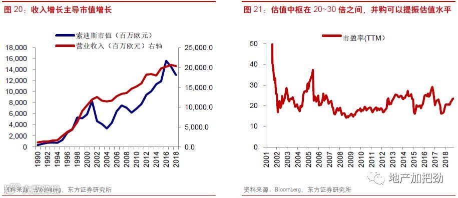 市值主要受收入变化影响,收并购活动可在一定程度上提振估值水平。在2001年以前公司持续进入新市场,实现收入的快速增长,驱动市值快速上升,2001年达到了119.4亿欧元,较1990年上涨918%。2001年公司进入稳定发展阶段,同时2001年的多宗并购进入消化期,在收入出现负增长的情况下,市值出现了较大幅度的调整。2004年市值跌至33.7亿欧元,仅为2001年的28%。随着2004年后收入重回增长以及后续一系列收并购的开展,市值开始恢复并创出新高,2018年市值为130.6亿欧元,较2004年上涨288%。估值方面,市盈率维持在中高水平,收并购的进行对于估值有一定的提振作用。总体来看,估值中枢在20~30倍之间。