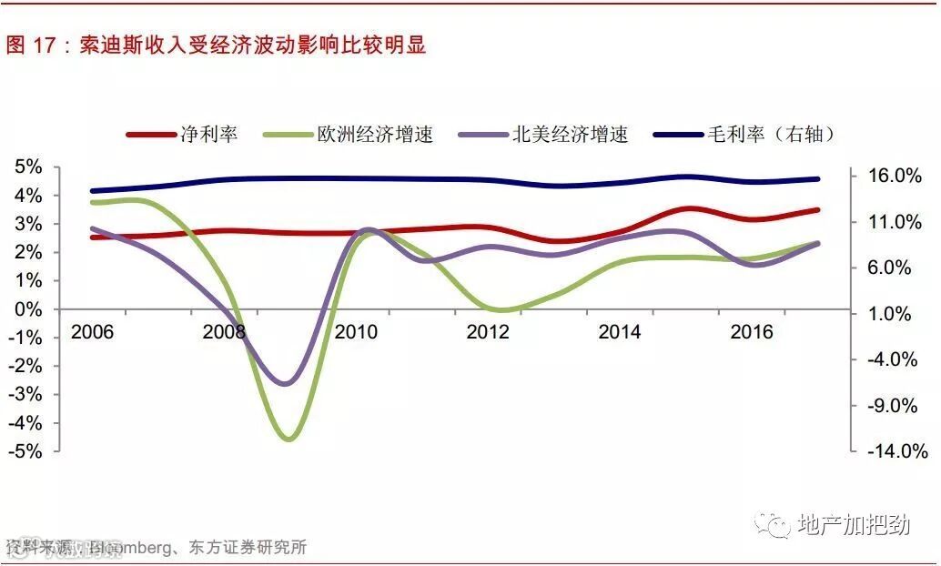 盈利能力十分稳定,抗周期性强。2006~2017年公司的毛利率维持在15%附近,波动幅度非常小,12年平均值为15.4%。净利率则维持在3%附近,同样十分稳定,12年平均值为2.9%。公司的盈利能力对于经济周期并不敏感,主要是因为公司经营的餐饮服务属于必需消费,在经济不景气的情况下,企业即使压缩支出、削减其他费用,也仍然会保证员工的餐饮支出。公司提供的设施管理、场馆管理等服务都是采取多年签约的模式,而且对于业主或企业而言同样有必需支出的属性。因此,经济周期的波动对于公司盈利能力的影响较小。在公司的收入结构中,北美和欧洲地区贡献了82%的收入,通过观察北美和欧洲经济增速与公司利润率的变化可以验证公司稳定的盈利能力。
