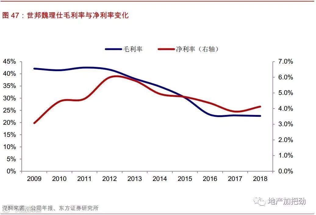 持续并购设备管理公司,外包业务比重上升,毛利率逐渐下降。公司认为业主将物业外包给第三方专业机构进行管理是未来的发展趋势。公司从2013年开始重点收购设备管理公司,外包物业在收入中的比重逐渐上升。随着外包业务的增长,公司的盈利结构也发生了改变,2013年以前公司的租赁咨询和物业销售业务使得公司的毛利率常年维持在40%以上。从2013年开始,公司毛利率开始发生明显下滑,由2013年41.7%下降到了2018年的22.9%。而公司对净利率的控制比较稳定,2009~2018年公司的净利率一直保持4%~5%左右,这一变化的原因是公司成本结构中服务成本的比重上升和经营管理费用的占比下降。