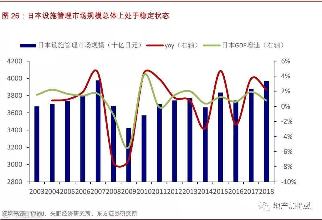 永旺永乐所处的日本设施管理市场已经进入成熟期,市场规模总体稳定。根据矢野经济研究所的数据,2003~2018年,市场规模从3.7万亿日元增长至4.0万亿日元,年均复合增速仅0.5%。日本的设施管理市场呈现出顺经济周期的波动的特点,当经济低迷时,新投资建设的楼宇数量会下降,企业会削减对于楼宇维护的支出。2003~2018年间日本的设施管理市场在2008~2009年金融危机期间出现了明显的下滑,其余时间大体保持稳定,增长率围绕零轴波动。
