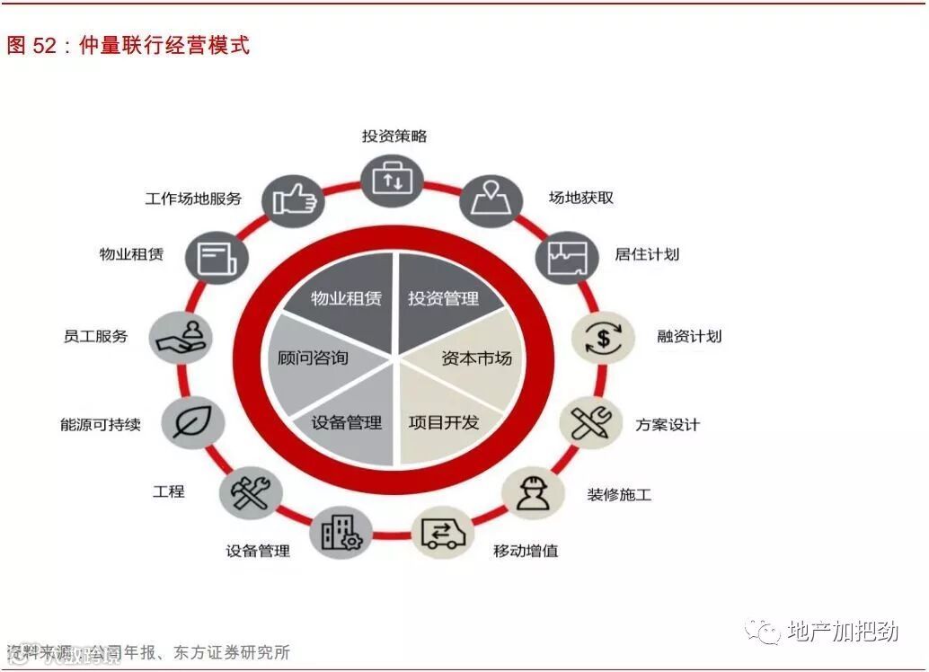 世邦魏理仕和仲量联行的最初都是从物业交易环节切入,如物业销售、租赁等。在积累了稳定的客户群体后,逐步开展咨询和物业管理业务。由于客户资源的不断累积和从事不动产管理带来物业信息的的持续沉淀,公司进入不动产估值和投资领域。在完成产业链全覆盖后,对业务板块进行整合,分为服务类和资本类。依靠服务和资本两类服务的双轮驱动,公司最终具备为全球客户提供不动产一体化解决方案的能力,实现交易型物管企业的商业闭环。