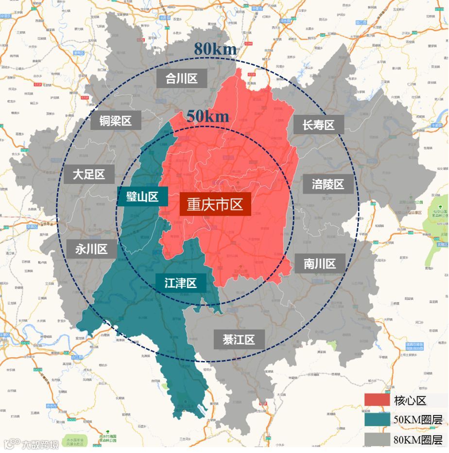 从城市圈来看,位于50KM圈层的江津区和璧山区综合实力分别为第二、第七名,综合实力优势突出;位于80KM圈层的共有8个区,永川区、涪陵区、合川区、綦江区、大足区、长寿区、铜梁区和南川区,综合实力基本都位列TOP10,仅南川区未挤入前十,位居第14名。整体来看,重庆市综合实力较强的区县主要都集中在80KM这一圈层内。
