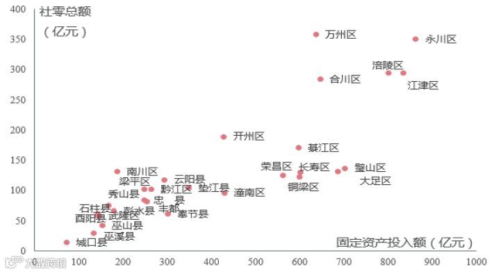 图:2017年重庆市区县固定资产投入额和社零总额