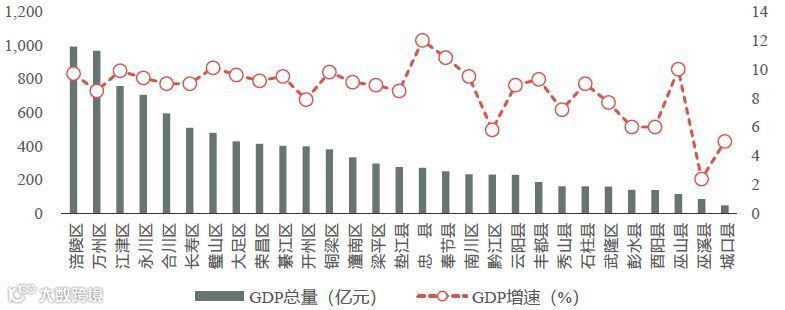 重庆市各区县经济发展落差较大,涪陵区2017年GDP总量居首位,达992.24亿元,接近1000亿元,万州区经济发展也较快,GDP达965.81亿元;而最低的为城口县,仅48.79亿元,各区发展参差不一。