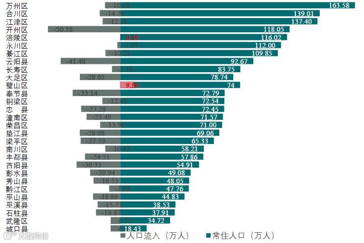 从人口流动来看,重庆市区县中仅璧山区和涪陵区实现人口净流入,其中璧山区人口净流入为9.5万人,涪陵区尽管实现人口净流入,但仅吸引0.19万人。其余区县均为人口净流出,人口吸附力较弱,开州区人口净流出最多,达50.38万人,人口流失率最严重的为酉阳县,人口净流出为30.35万人,占户籍人口35.60%,相对于每100个人里面有近36个人外出。