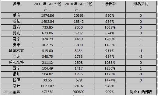 南宁与西宁,GDP也扩大了12倍多。重庆和成都的表现相当,虽高于全国水平,但均略低于西部12城的平均增速。毕竟,规模在那。