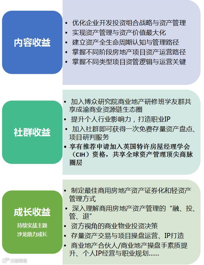 含:商用房地产开发、运营和资产管理的经验和案例分析,典型案例包括购物中心、办公楼、公寓、旧改项目等。