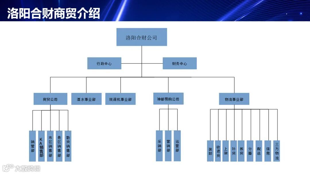 如图所示,洛阳合财商贸现在的组织架构就是两大中心五大事业部,每个事业部都是独立核算的。