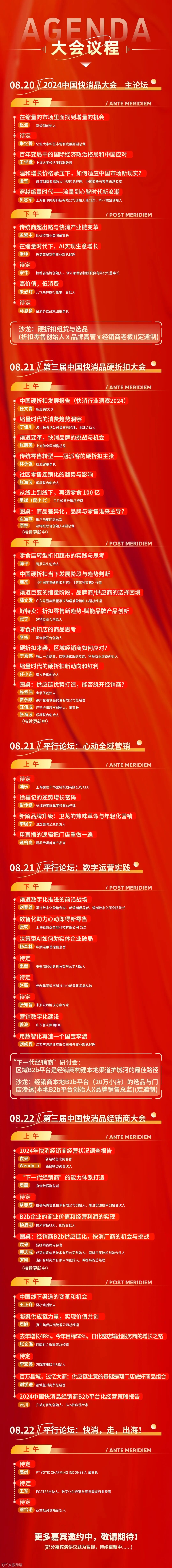 2024年8月20日-22日,以“穿越缩量时代”为主题的「2024第六届中国快消品大会」暨「第三届中国快消品硬折扣大会」&「第三届中国快消品经销商大会」,将在上海隆重举行。