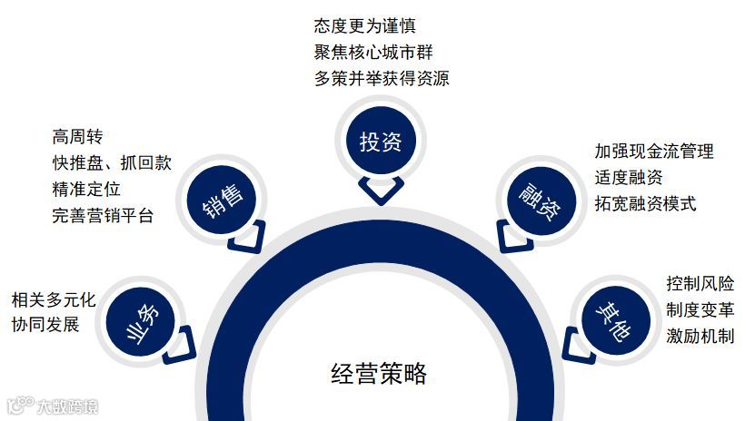 在基于对未来环境预判的基础上,房企也适时调整自身的经营策略,主要集中于销售、投资、融资、业务等几个方面。具体来看: