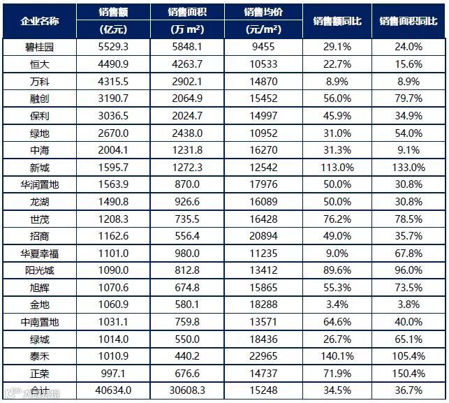 2018年1-9月,20家房企销售金额共计4.06万亿元,销售面积为3.06亿平方米,同比分别增长34.5%和36.7%。其中,碧桂园、恒大、万科、融创、保利5家企业销售金额超过3000亿元。