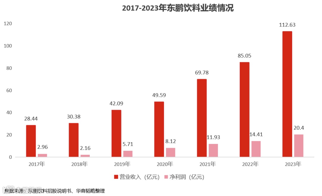 2023年,东鹏饮料销售额达112.63亿,净利润20.4亿,是全国化刚开始时的十倍。