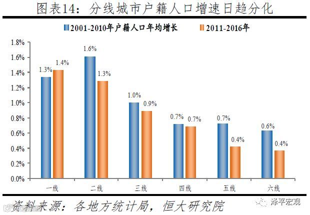 在2010年后,随着户籍制度改革深入推进,分线城市户籍人口增速的梯度分化显化,2011-2016年一二三线户籍人口年均增速分别为1.4%、1.3%、0.9%,而同时期常住人口年均增速分别为1.5%、1.3%、0.8%,一线城市因严控户籍导致户籍人口增速稍低于常住人口,二线城市户籍人口增速持平于常住人口,而三线城市户籍人口年均增速已高于常住人口。2017年初城市“抢人”大战火热展开,二线城市户籍人口增速有望进一步上升。四五六线户籍人口年均增速分别为0.7%、0.4%、0.4%,对应的常住人口增速分别为0.6%、0.2%、0.3%;其中五六线城市户籍人口增速较2001-2010年明显下滑,表明在外出人口有所回流的同时户籍人口明显外流。