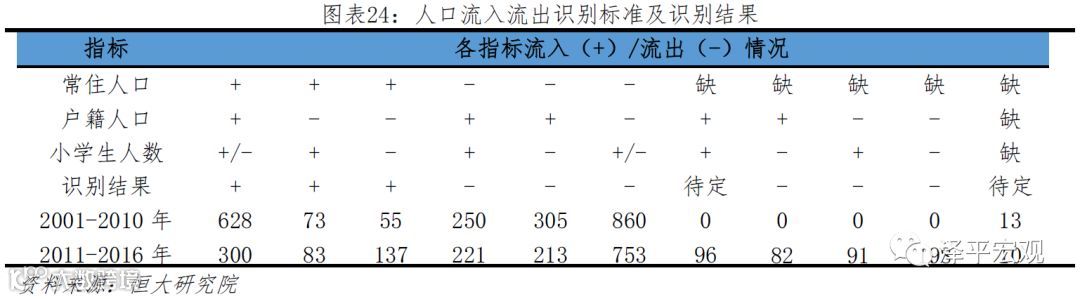 8)若常住人口缺失、且户籍人口和小学生均流入,从历史经验看难以判断其常住人口是否流入,2001-2010年流入概率仅36.9%,2011-2016年为52.6%,因此将这种类型地区列为待定。