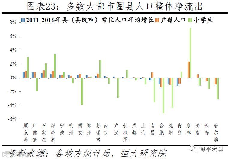 3)、对房地产市场,当某地常住人口减少或增长低于自然增长、但户籍人口和小学生明显增长,则该地区的购房需求不一定下降,甚至可能会上升。其中的逻辑在于,户籍人口的置业需求一般高于常住人口中的常住外来人口。不少常住外来人口收入较低、只是来当地挣钱,并没有购房能力及需求,因此常住人口增长只是在个体同质化假设下代表名义购房需求上升。当外来人口在当地落户或将家属子女随迁后,真实购房需求或将上升。反之,若某地常住人口增长超过自然增长,也即常住人口流入时,如户籍人口和小学生都减少,则该地区的购房需求也不一定必然上升。