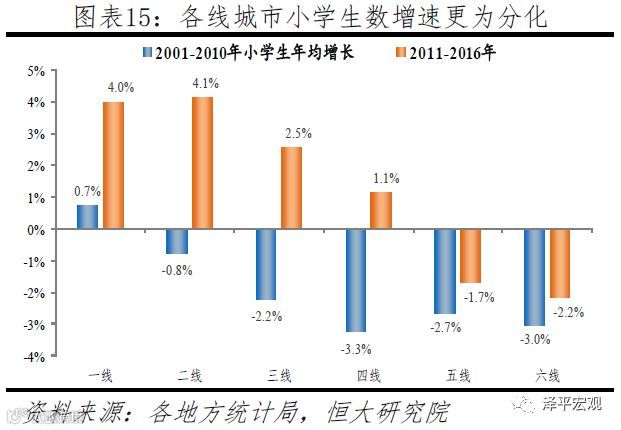 而到2011-2016年,在全国小学生数年均增长为0的背景下,一二三线城市小学生数年均增速分别为4.0%、4.1%、2.5%,而四五六线城市小学生年均增速分别为1.1%、-1.7%、-2.2%,分线城市增速最大值和最小值的差扩大到6.3个百分点,一线城市因学位供需紧张而增速略低于二线城市。