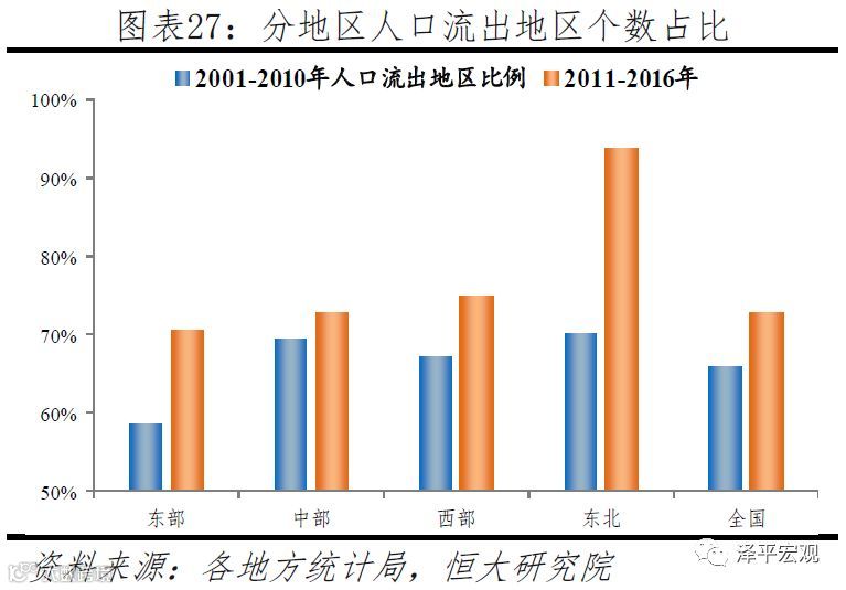 东部地区人口流出地区个数从2001-2010年的285个增至2011-2016年的343个,占比从58.6%增至70.6%;中部地区人口流出地区个数从2001-2010年的380个增至2011-2016年的399个,占比从为69.5%增至72.9%;西部地区人口流出地区个数从2001-2010年的584个增至2011-2016年的652个,占比从67.2%增至75.0%;东北地区人口流出地区个数从2001-2010年的122个增至2011-2016年的163个,占比从70.1%增至93.7%。